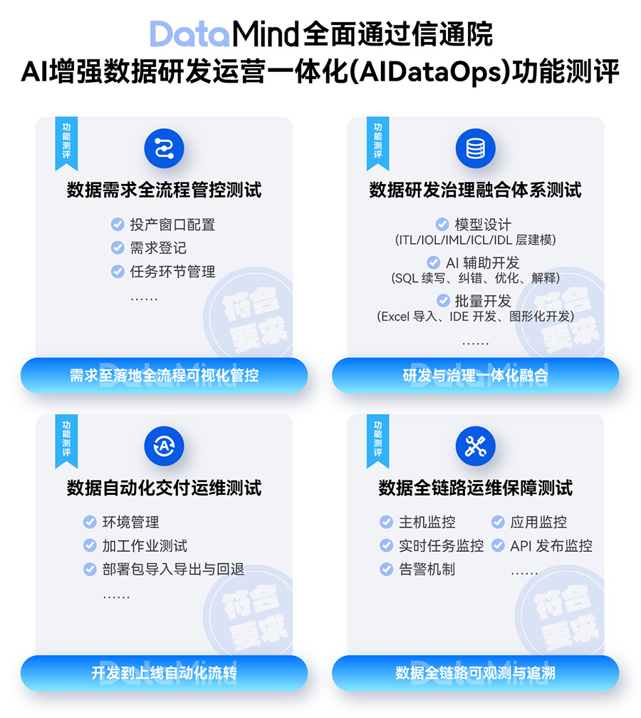 本次測評(píng)由信通院主導(dǎo),依據(jù)《AI 增強(qiáng) - DataOps 功能測試方案 V1.0 2025》標(biāo)準(zhǔn),對DataMind的AI增強(qiáng)DataOps組件展開了全方位、深層次的功能驗(yàn)證。
