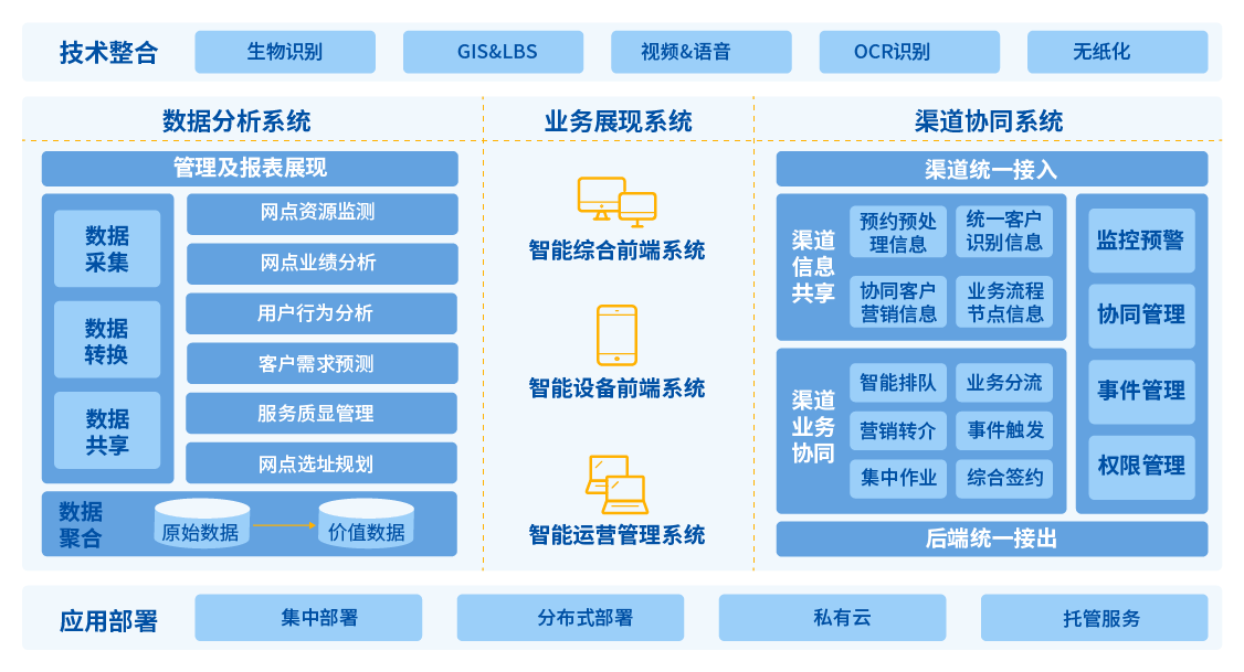 網點智能化服務流程離不開網點各系統的協同作業。而要實現多系統協同作業,網點首先需要對各渠道系統實現集中接入,完成對客戶各個接觸點的統一數據采集、監測及分析;并在此基礎上,實現網點的協同精準營銷和協同客戶服務體驗。